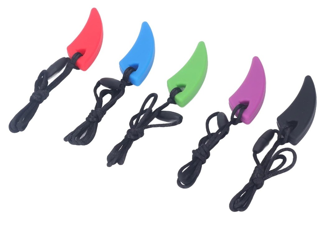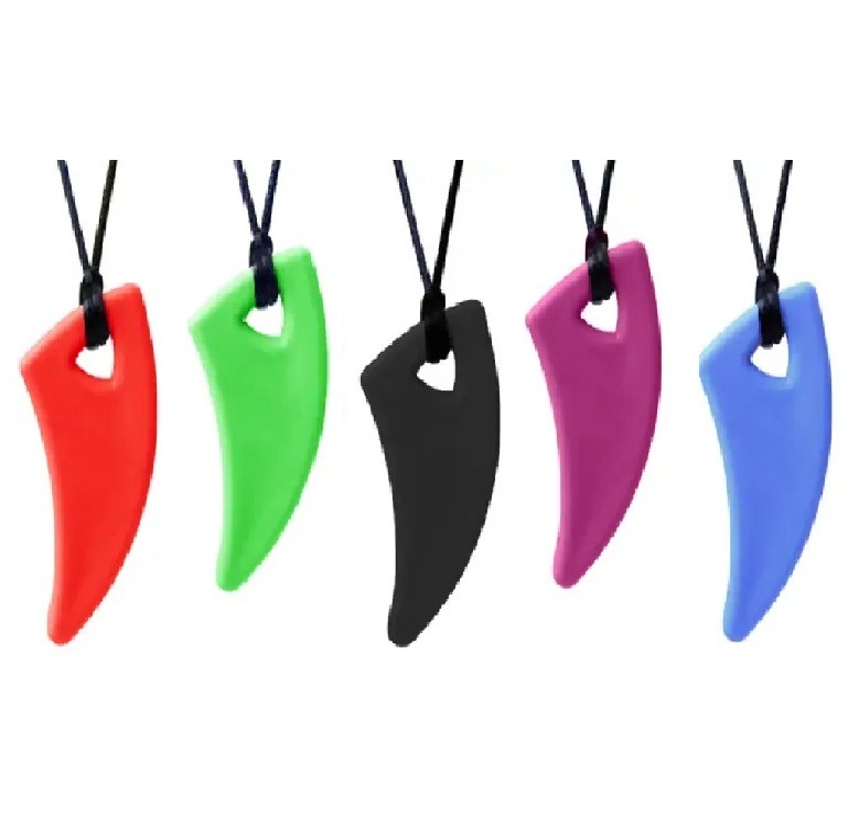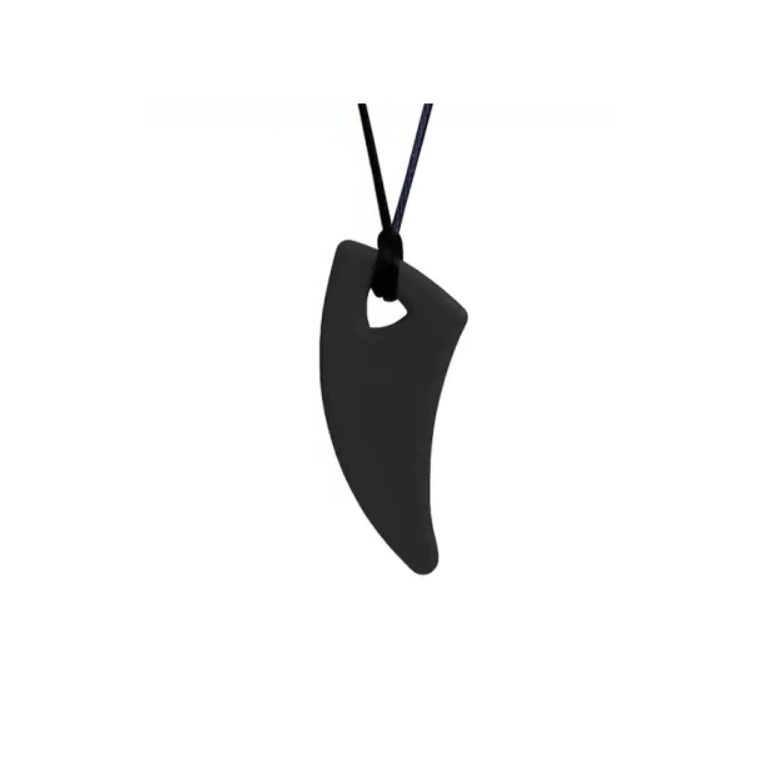 Deze bijtketting is beschikbaar in meerdere vrolijke kleuren. Het sieraad is gemaakt van stevig silliconen. De slagtand heeft een gebogen vorm voor een extra tactiele ervaring. Dit kan zowel in de handen als de mond een prettig gevoel geven. De lange hanger heeft een aangename dikte om in de mond te houden.