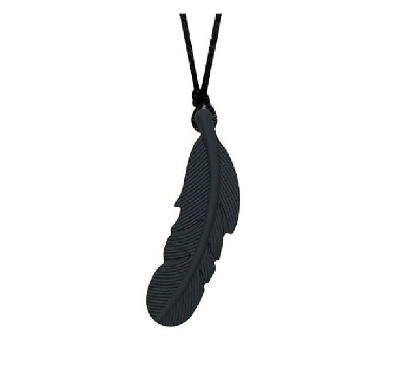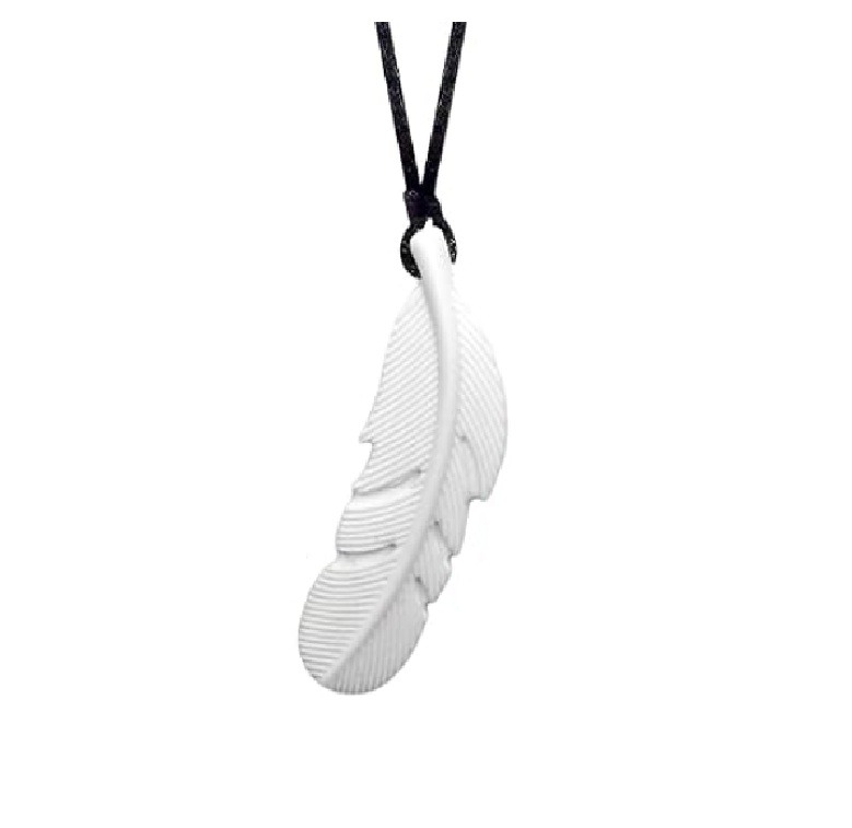 Deze bijtketting is beschikbaar in meerdere vrolijke kleuren. Het sieraad is gemaakt van stevig silliconen. De veer heeft een gebogen vorm en is geribbeld voor een extra tactiele ervaring. Dit kan zowel in de handen als de mond een prettig gevoel geven. De lange hanger heeft een aangename dikte voor babies en peuters om in de mond te houden.