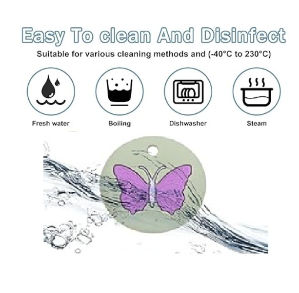 Deze bijtketting komt in een grijs met paarse kleur. Het sieraad is gemaakt van stevig silliconen. De hanger heeft de vorm van een schijf met daarop een vlinder met relief voor een extra tactiele ervaring. De achterzijde van de schijf bevat nopjes. Dit kan zowel in de handen als de mond een prettig gevoel geven. De lange hanger heeft een aangename dikte om in de mond te houden.