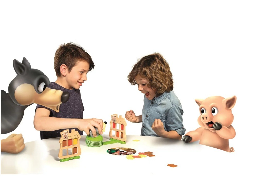 Wanneer de draaischijf aangeeft dat het tijd is om te blazen, kies je welk huisje je wil wegblazen met de Grote Boze Wolf blazer.